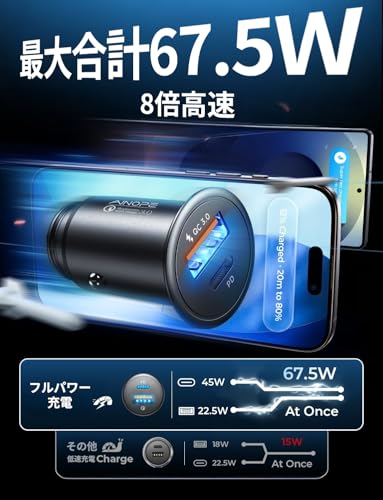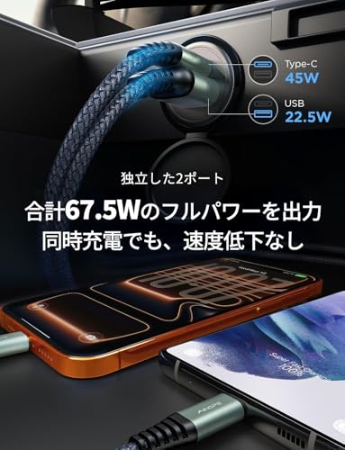 このシガーソケット充電アダプタは、USB-A QCポート出力が最大 22.5W、そしてUSB-C PDポート出力が最大 45W。つまり、MacBook Airも充電できるそうです。しかも、同時に充電しても大丈夫とのこと。
