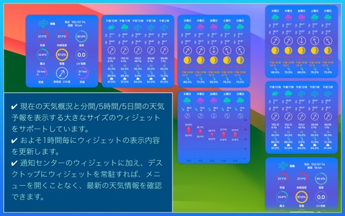 “ForcastMenu”は、今日を含めた10日間の天気予報を、温度、降水確率、降水量、積雪量の推移を示すチャート図と、日々の詳しい予報データで確認できるメニューバー常駐アプリです。現在地以外に、予め設定した場所またはその場で検索した場所の天気も確認できます。現在の天気概況と、現在時刻を起点にした時間毎の天気予報も閲覧できます。また、メニューバーに天気概況のアイコンと気温、体感温度、降水確率などの天気データ、Dockアイコンに天気概況のアイコンと湿度や雲量を表示する機能もサポートしています。